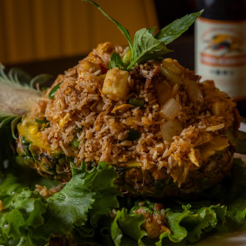 Special fried rice with pineapple, red & green bell pepper, yellow onion, Thai basil, shrimp, and roast duck in Thai spicy sauce. Served in half a pineapple.