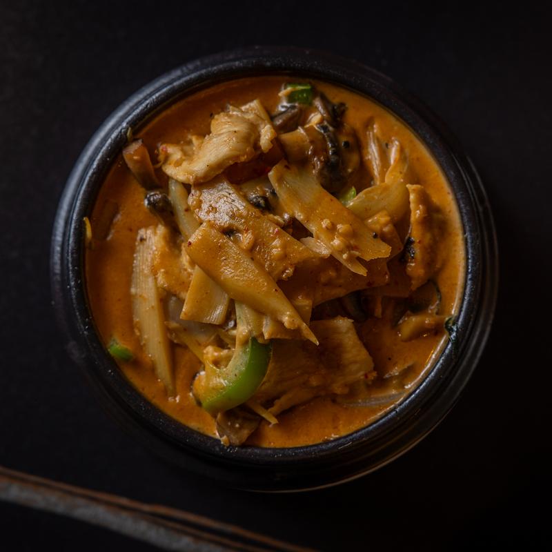 With ginger, Kaffir lime leaves, sliced bamboo, white mushrooms, potato, and high-heat stir-fried in yellow onion with coconut milk, "Yellow-Curry sauce. Served with a side of jasmine or brown rice.