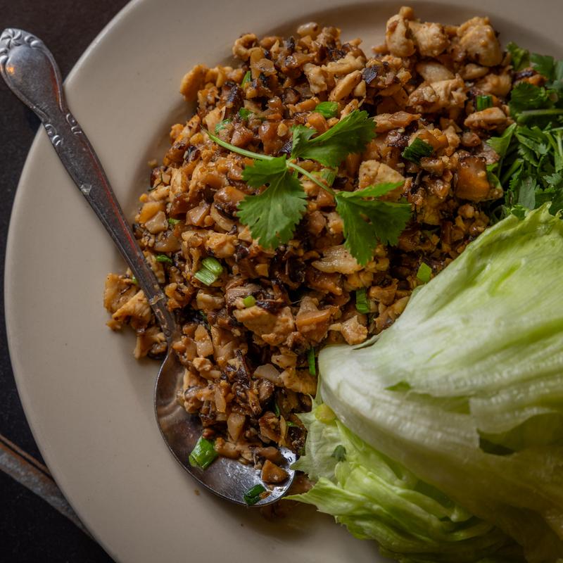 Chicken, green onion, water chestnut, shiitake mushroom, iceberg lettuce.